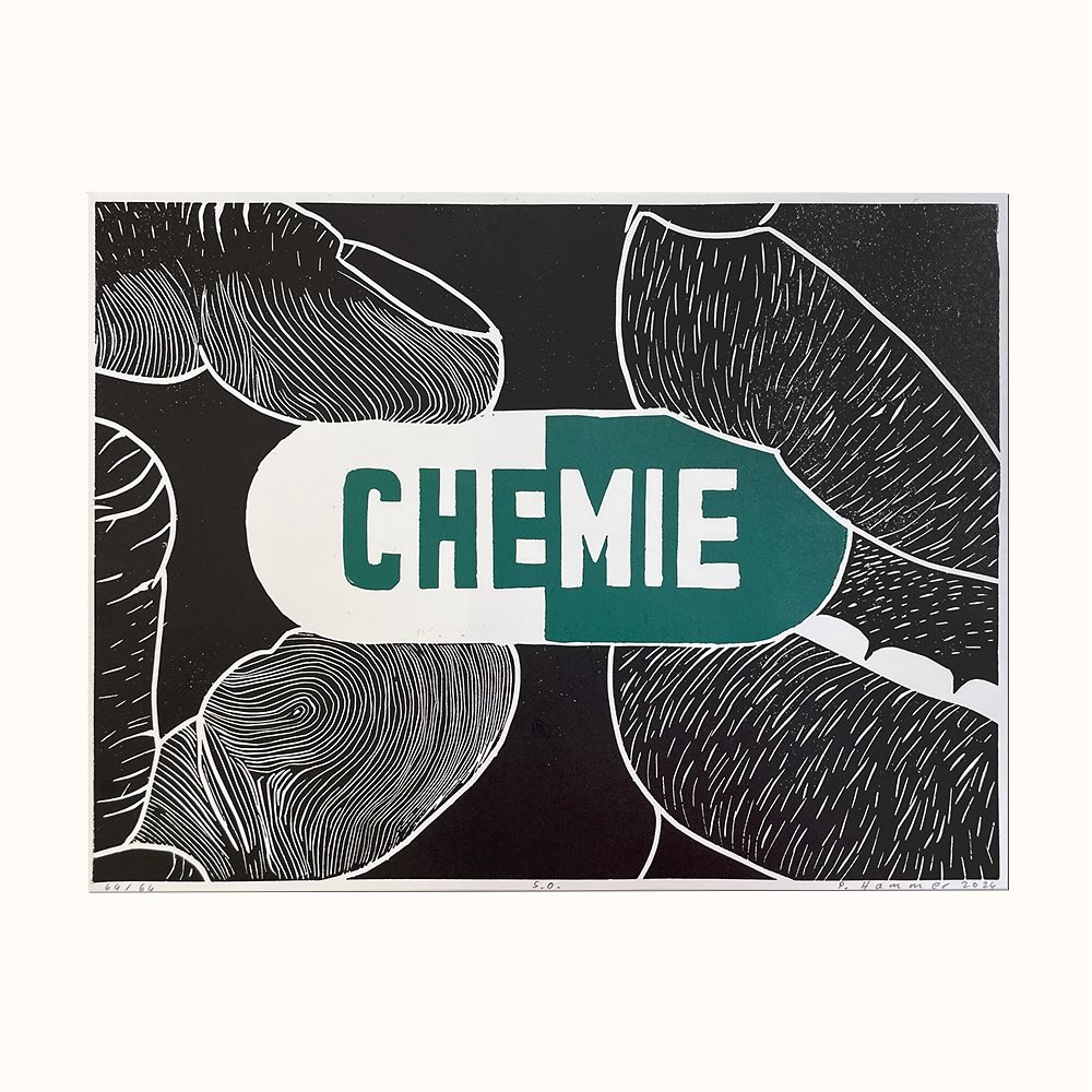 Für die Chemie Leipzig schuf Hammer eine Druckgrafik, die die Chemie als eine Pille darstellt, die